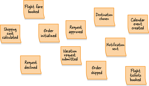 - Người tham gia viết các sự kiện đã xảy ra (domain events, thì quá khứ) bằng sticky note màu cam → sắp xếp theo dòng thời gian