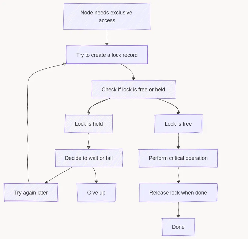 - Nếu chưa có lock, node sẽ tạo một lock, chẳng hạn bằng cách set một Redis key với TTL, hoặc tạo một ephemeral zNode trong ZooKeeper.