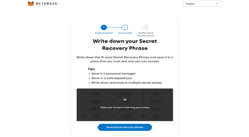 MetaMask sẽ hướng dẫn bạn cách bảo vệ seed phrase — đây là phần quan trọng nhất.