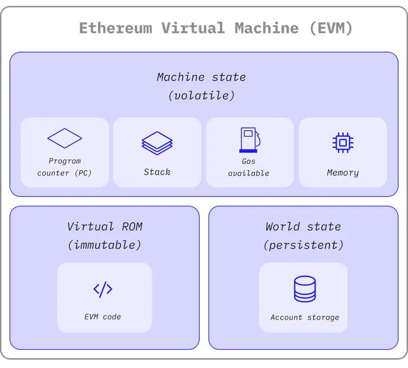 Mọi thứ chạy trên Ethereum đều đi qua một “cỗ máy tưởng tượng” gọi là Máy Ảo Ethereum (Ethereum Virtual Machine – EVM). Bạn có thể coi nó như một CPU toàn cầu — ai cũng có thể gửi đoạn mã (smart contract) để máy này chạy.